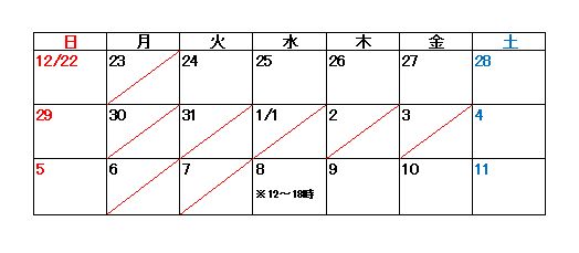 2019.12.19 年末年始営業日のご案内 カテゴリー: ご案内その他 年末年始休業のお知らせ 平素は格別のご愛顧を賜り厚くお礼申し上げます。 誠に勝手ながら12月30日(月)から翌年1月3日(金)まで お休みとさせて頂き、翌4日(土)より通常営業とさせて頂きます。 また、1月8日(水)は社内行事の為、12:00~18:00に短縮しての営業とさせて頂きます。 ご迷惑をお掛け致しますが何卒宜しくお願い申し上げます。